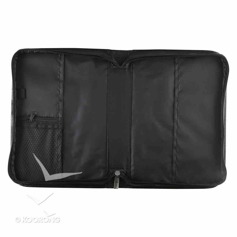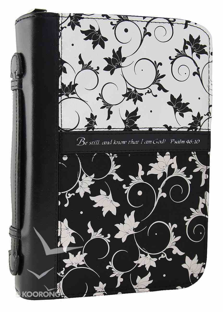:This Black and White Print Bible Cover is done in a floral swirl patterned micro-fiber. The front features the screen-printed debossed text of Psalm 46:10, “Be still, and know that I am God.” The spine and back are made of black faux leather. The outside back cover has a handy pocket for notes. The Bible cover features an exterior zipper with a cross engraved zipper-pull and a convenient lay-flat hand strap, a small zipped mesh interior pocket and 1 inside pen loop for easy access to your pen or marker.